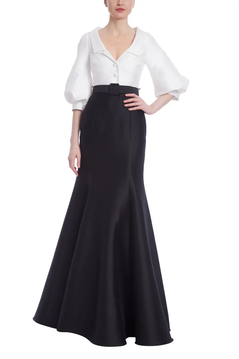 Badgley Mischka Collared Neck Puffy-Sleeved Belted Two-Tone Mikado Shirt Mermaid