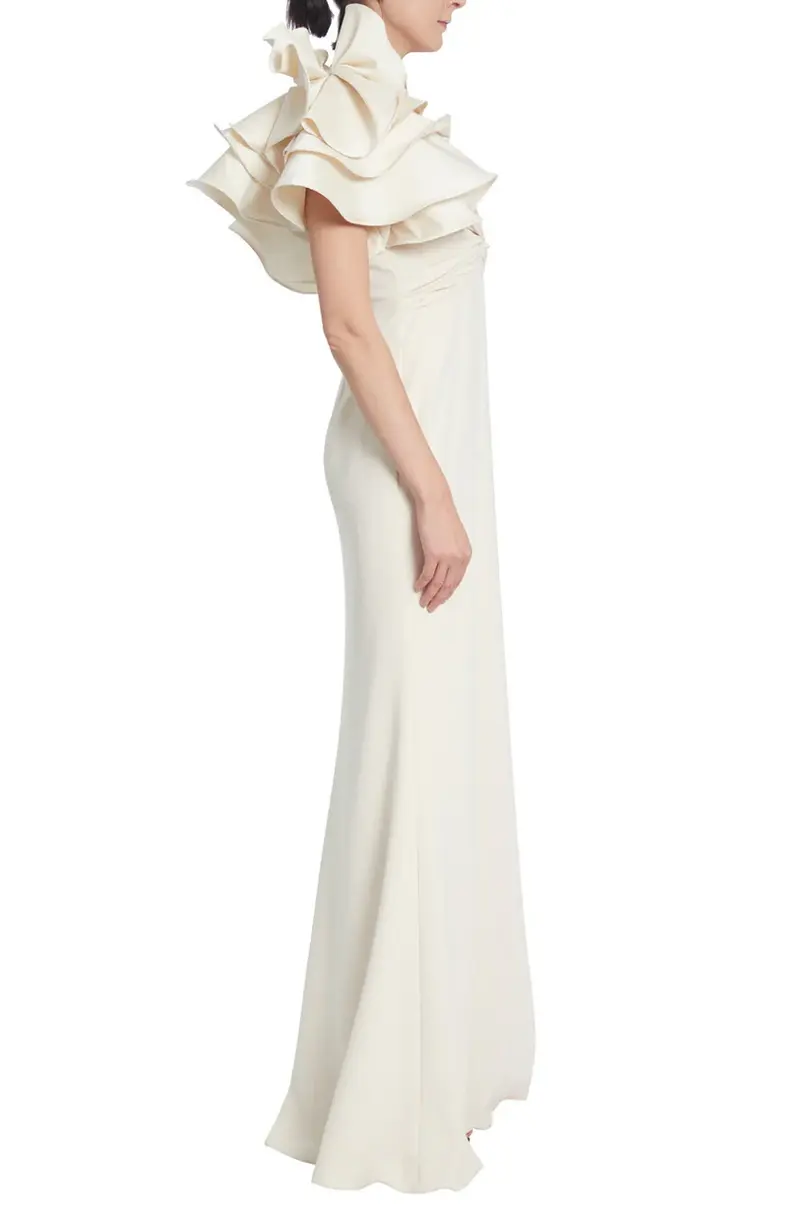 Badgley Mischka V-Neck Ruffled Shoulders Ruched Short Sleeve Mikado Gown