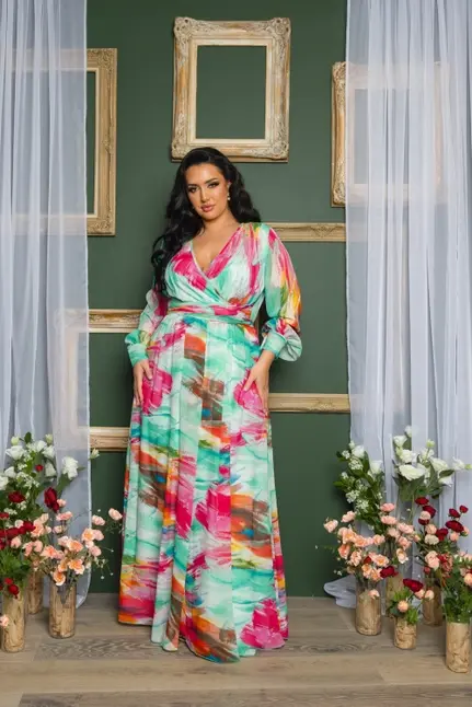 Floral print chiffon maxi dress featuring bishop sleeves. Surplice neck and multi-way waist tie. Very good elastic at waist. Fully lined on top & skirt.