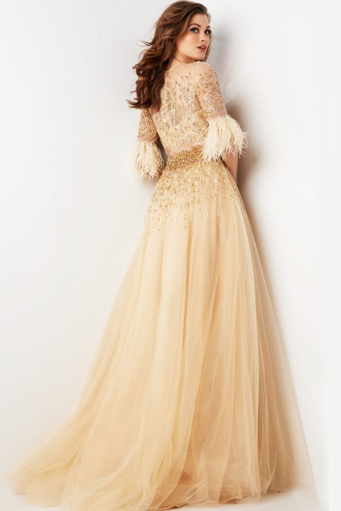 The beaded belt at the waist enhances the figure and adds a touch of refinement to the ensemble. Moreover, the feather hem sleeves provide a unique and luxurious detail, adding drama and sophistication to the overall look.