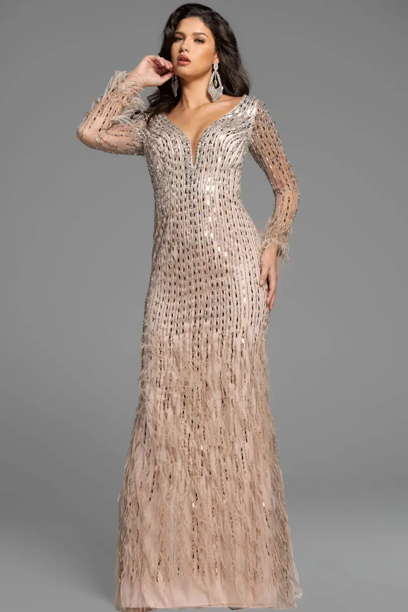 Jovani Long Sleeve Gown With Feather And Sequin Embellishments 37552