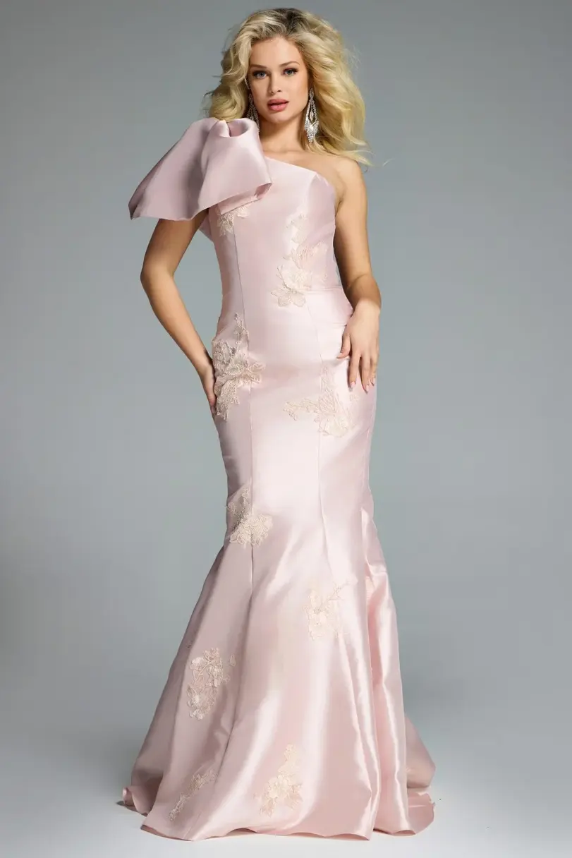 This elegant blush evening gown features a graceful mermaid silhouette, hugging the body through the bodice and hips before fanning out softly near the hem. The design showcases a one-shoulder neckline with an eye-catching large bow accent, adding a touch of drama. Intricate floral appliques delicately adorn the fabric, enhancing its sophistication. The luxurious satin finish offers a subtle sheen, perfect for special occasions.
