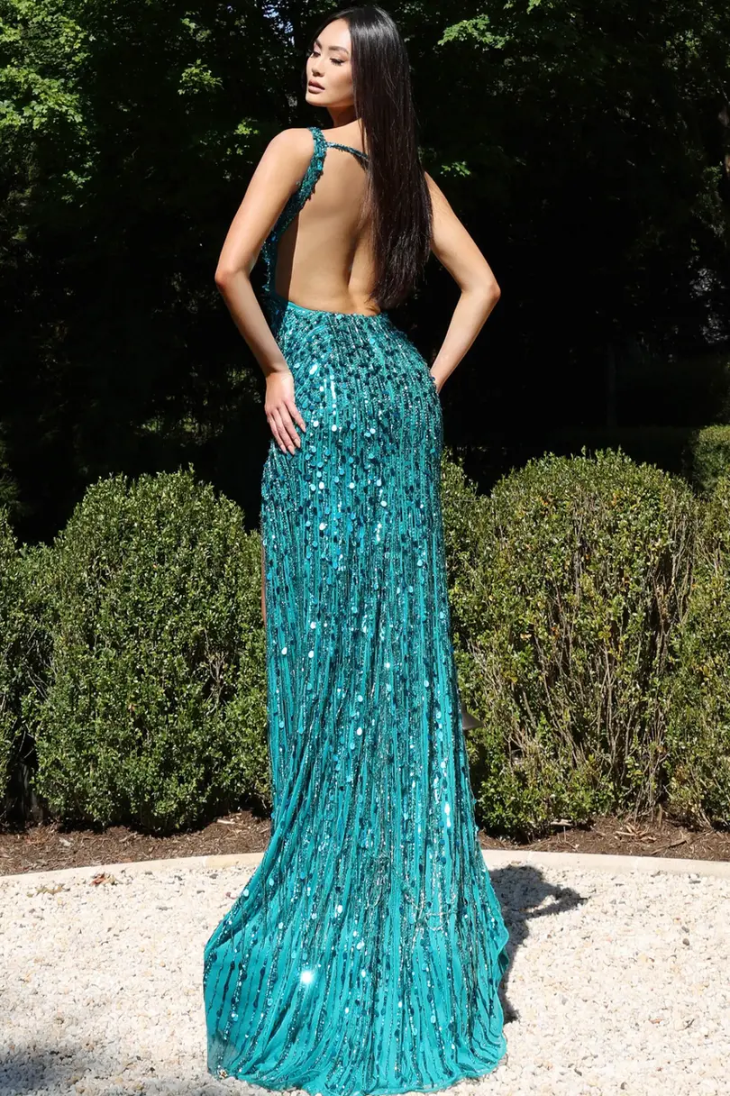 Jovani Plunging Sequin Gown with High Slit and Open Back 43623