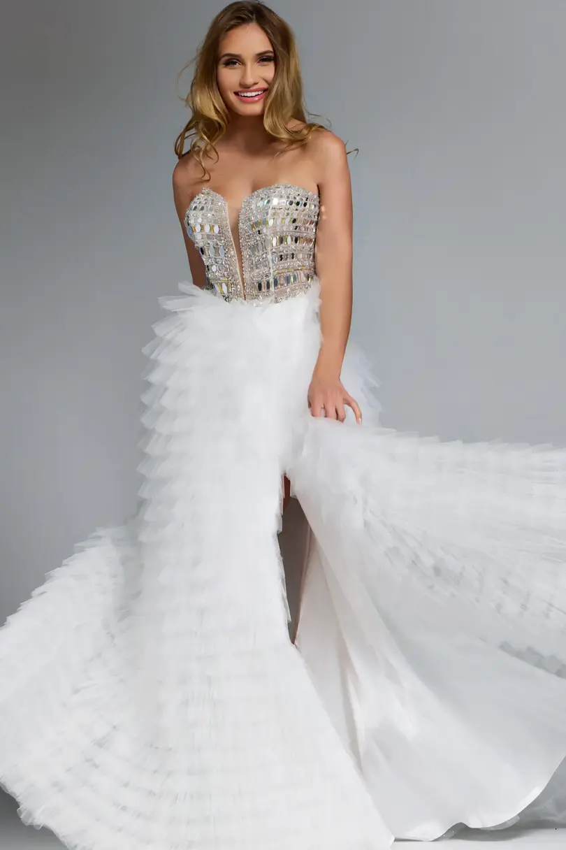 Jovani Strapless White Tulle Gown With Beaded Corset Bodice 43412