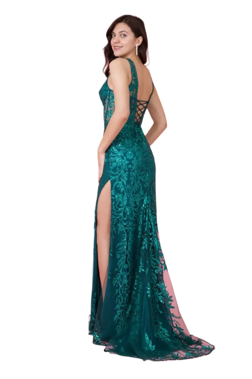 Jovani Deep V Neck Sequin Gown with Side Cutouts 47793