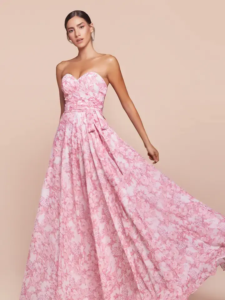 This A-line dress features a strapless sweetheart neckline and a fitted bodice with a removable belt or sash at the gathered waistline. Crafted from soft satin in a delicate floral print, the flowy skirt adds an elegant touch. Perfect for bridesmaids, wedding guests, or formal events, this dress offers both style and grace. Key Features: Silhouette: A-line Design: Strapless sweetheart neckline, removable belt / sash & gathered waistline Fabric & Material: Soft satin in floral print Fit Detail: Flowy skirt & fitted bodice Occasions: Ideal for bridesmaids, wedding guests & formal events