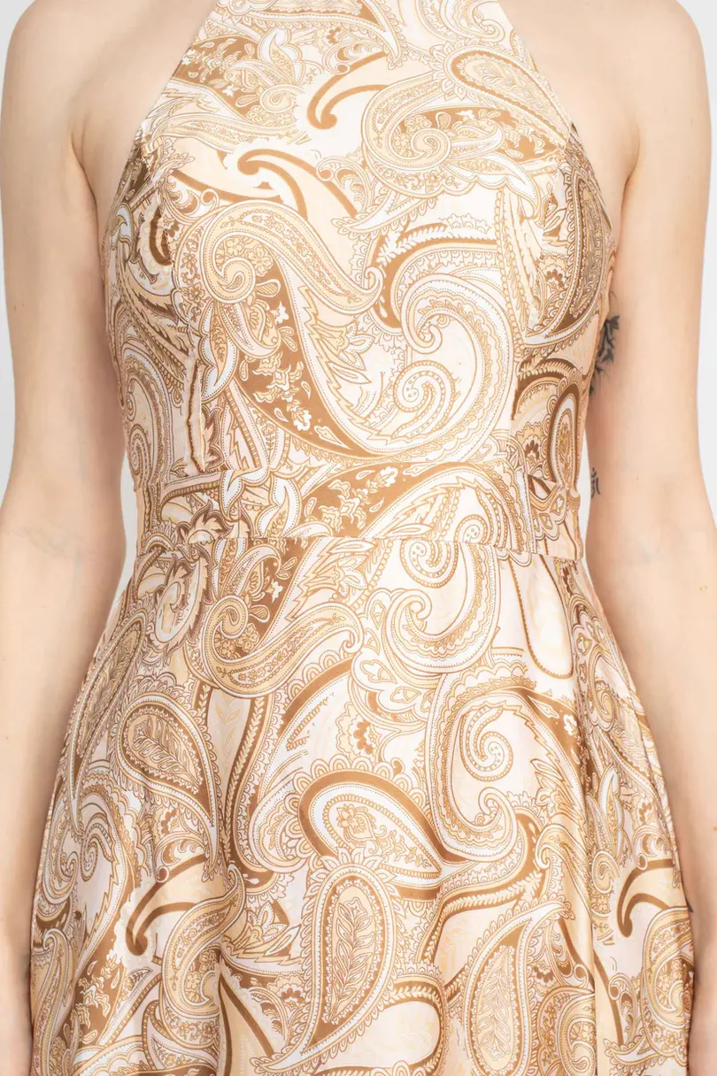 This dress features a flattering fit and flare silhouette, adorned with a paisley print. The halter neck and tie back add a touch of elegance, while the zipper back offers a secure fit. Made from satin, this dress is perfect for any occasion.